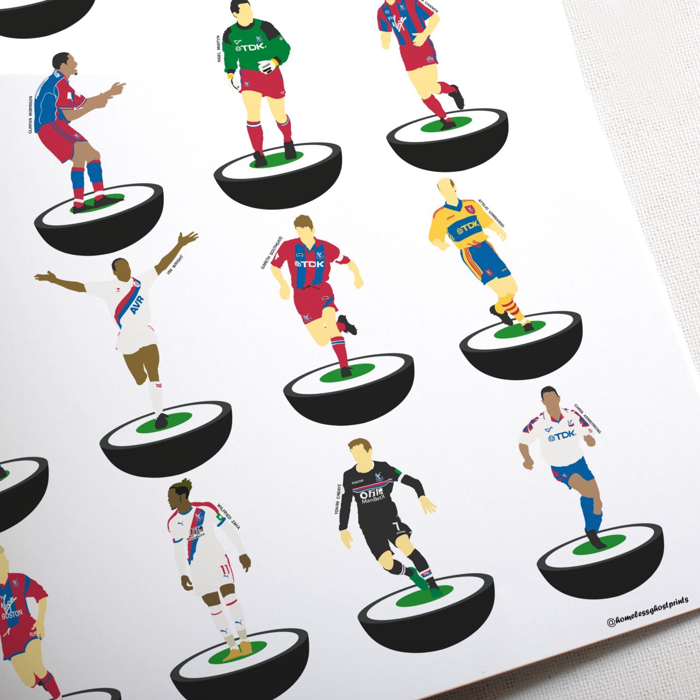 It features artwork inspired by past and present Crystal Palace players in the Subbuteo style. Players like Ian Wright, Gareth Southgate and Wilfried Zaha all feature.