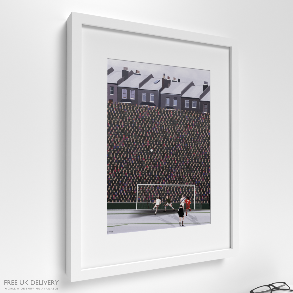 Daniel Griffin ‘Snowy Holmesdale’ Art Print. Depicting a 1970’s wintry game at Selhurst Park with the old Holmesdale road stand and terraced houses in the distance.