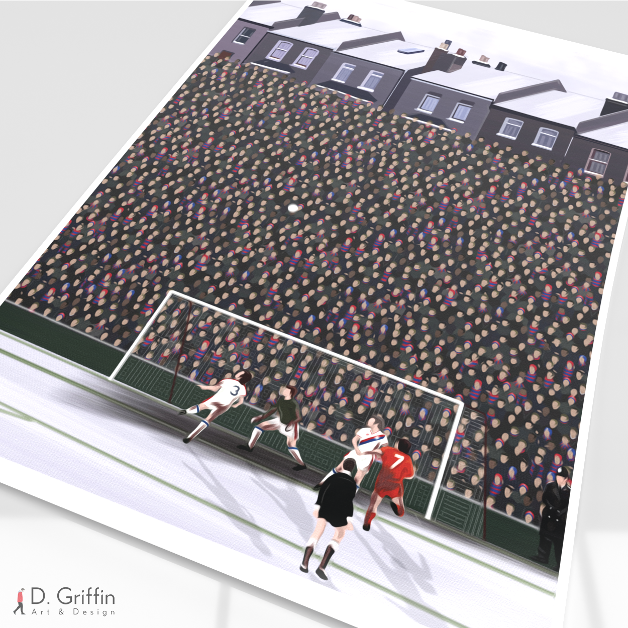 Depicting a 1970's wintry game at Selhurst Park with the old Holmesdale road stand and terraced houses in the distance.