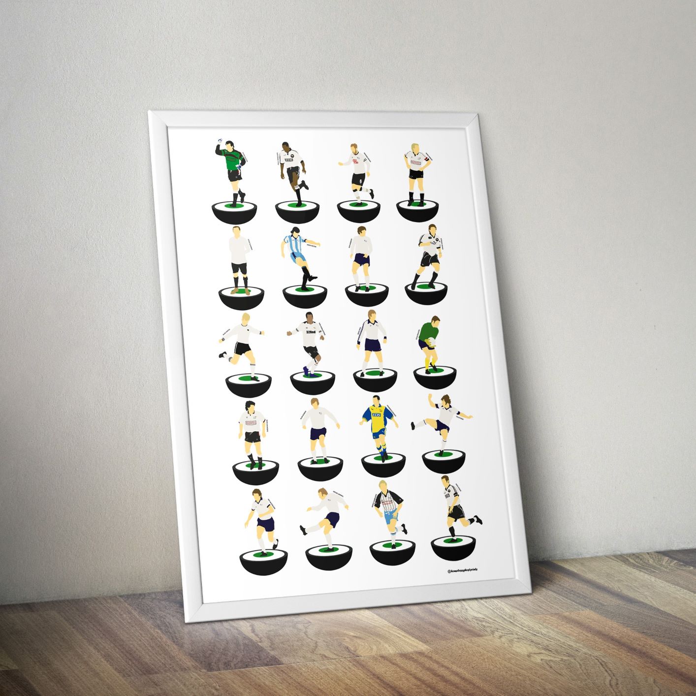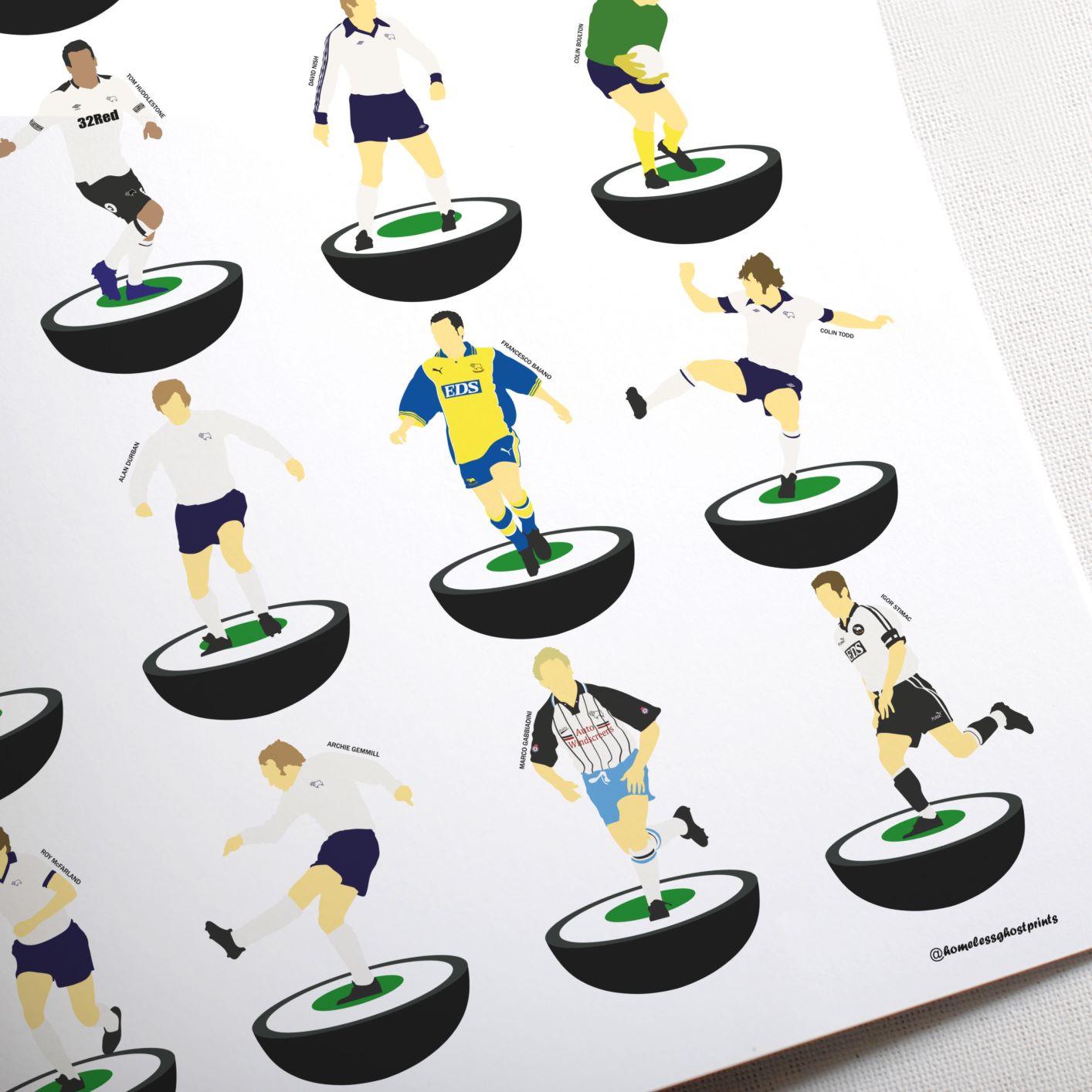 It features artwork inspired by past and present Derby County players in the Subbuteo style. Players like Paulo Wanchope, Peter Shilton, David Nish, Igor Stimac and Francesco Baiano all feature.
