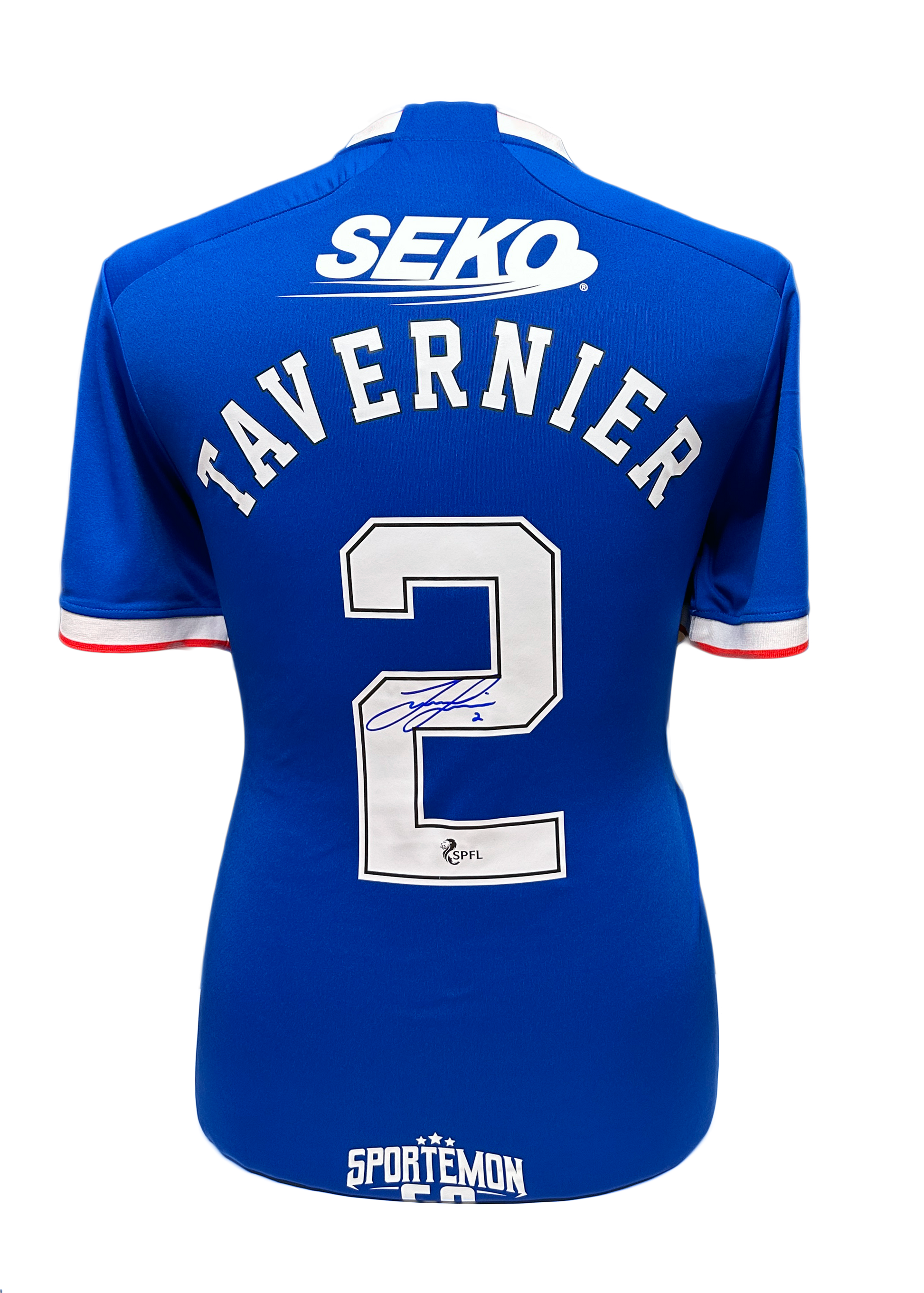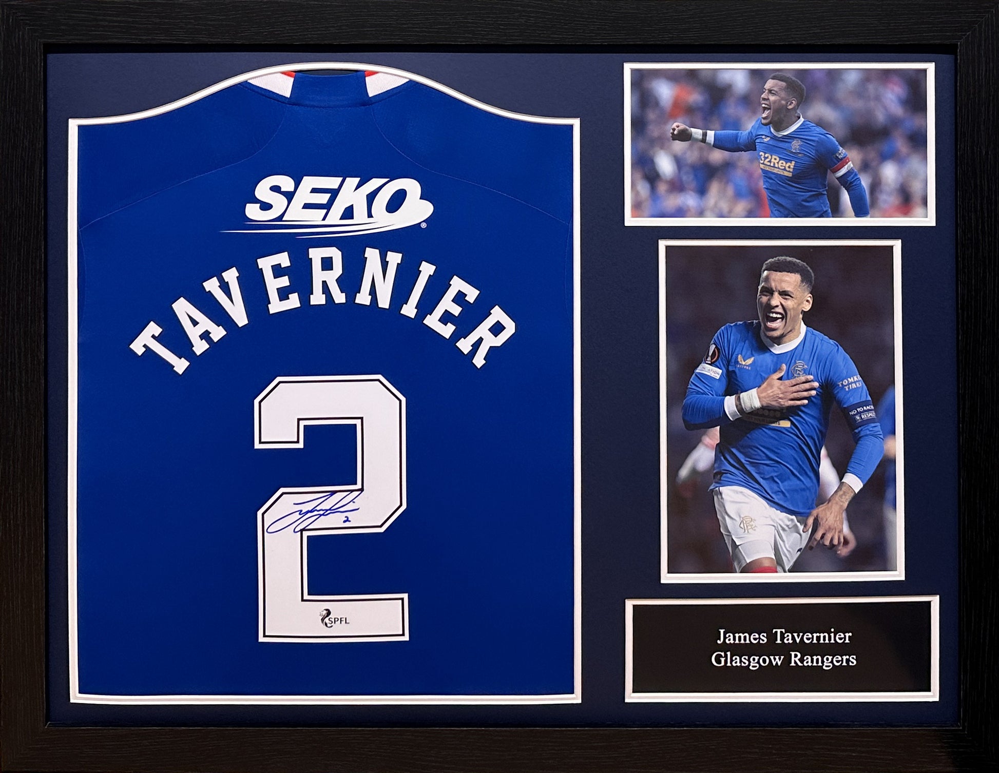 This is an official 2022/23 Rangers shirt signed by current team captain James Tavernier at a signing session in Glasgow, 10th May 2023.