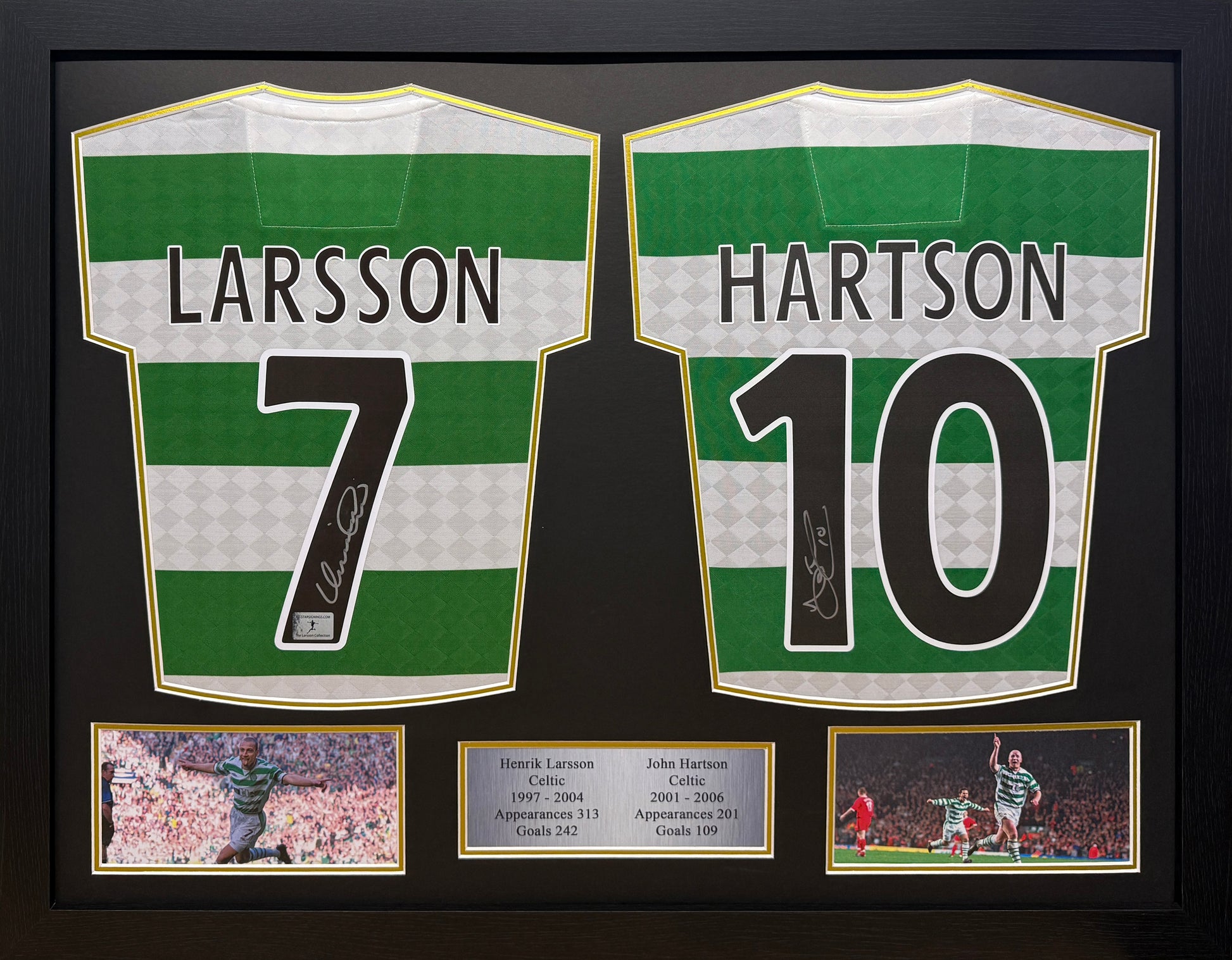 Honour two of Celtic's finest with this striking dual-signed framed display showcasing Henrik Larsson and John Hartson in authentic 1988 centenary retro shirts. Larsson's shirt, signed 14th May 2025 in Copenhagen, features the exclusive "The Larsson Collection" hologram guaranteeing provenance. Hartson's shirt was personally signed 1st May 2024 in Gretna. Both signatures were secured through exclusive Allstarsignings private sessions, ensuring complete authenticity. Mounted in a prestigious 915x715mm frame, this commanding display captures two transformative figures in Celtic's modern era. Perfect for collectors and devoted supporters seeking a museum-quality centrepiece that celebrates the club's greatest partnerships.