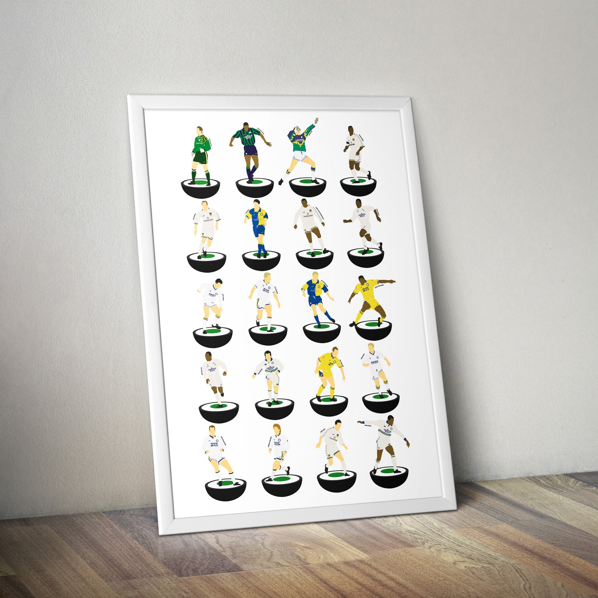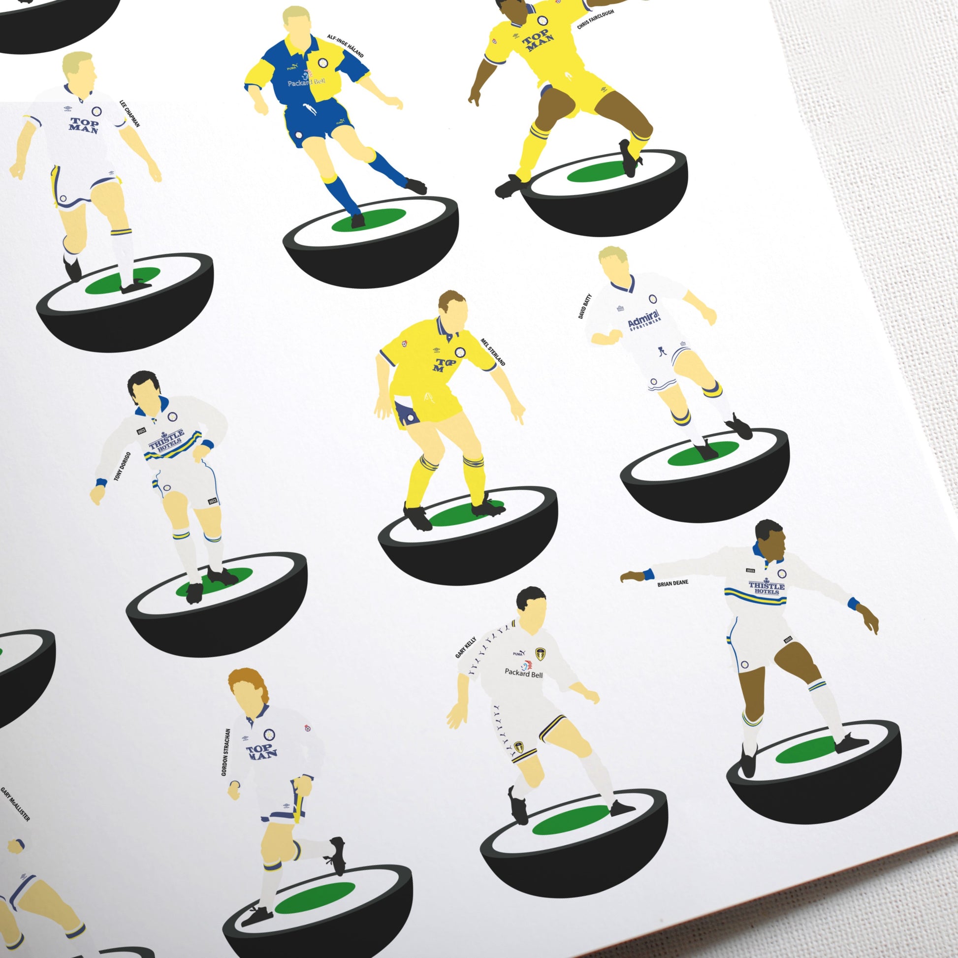 It features artwork inspired by past and present 90’s Leeds United players in the Subbuteo style. Players like Gary Speed, David Batty, Lee Chapman and Gary Kelly all feature.