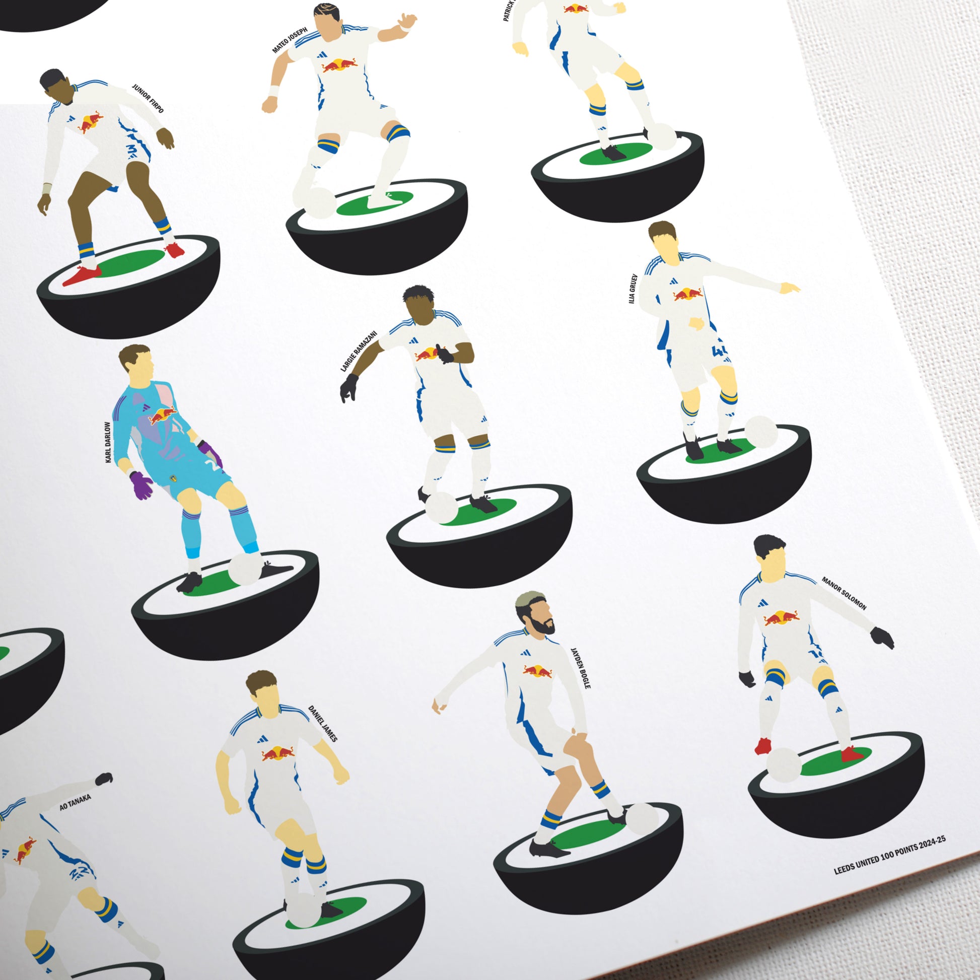 It features artwork inspired by the 2025 champions Leeds United players in the Subbuteo style.