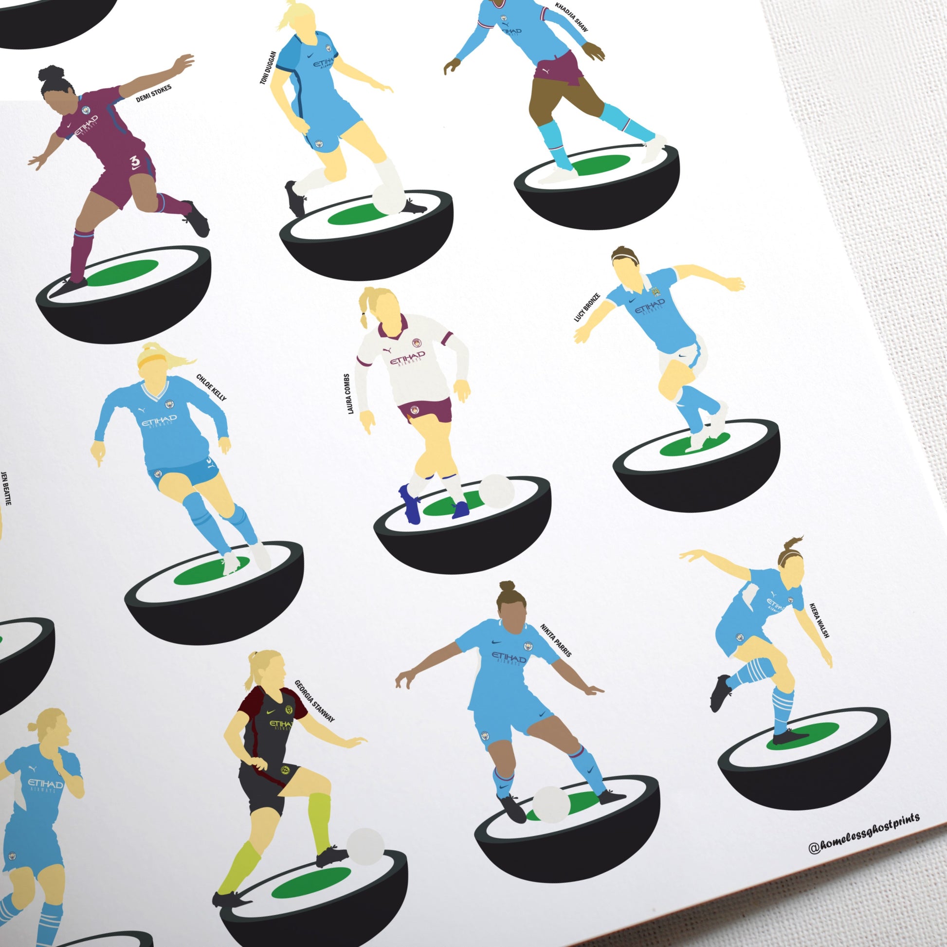 It features artwork inspired by past and present Manchester City Ladies players in the Subbuteo style. Players like Lucy Bronze, Jill Scott, Khadija Shaw, Steph Houghton and Toni Duggan all feature.