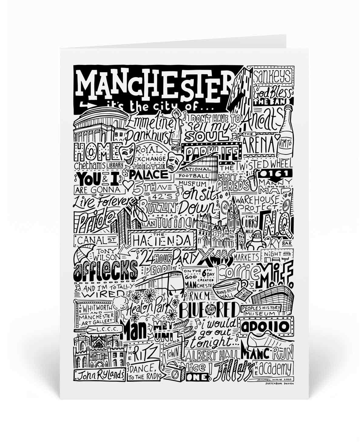 This Manchester Landmarks Greetings Card features all of the iconic places, landmarks and people that make Manchester famous. This card would be perfect for people who call Manchester home or have spent time living or studying in the city.