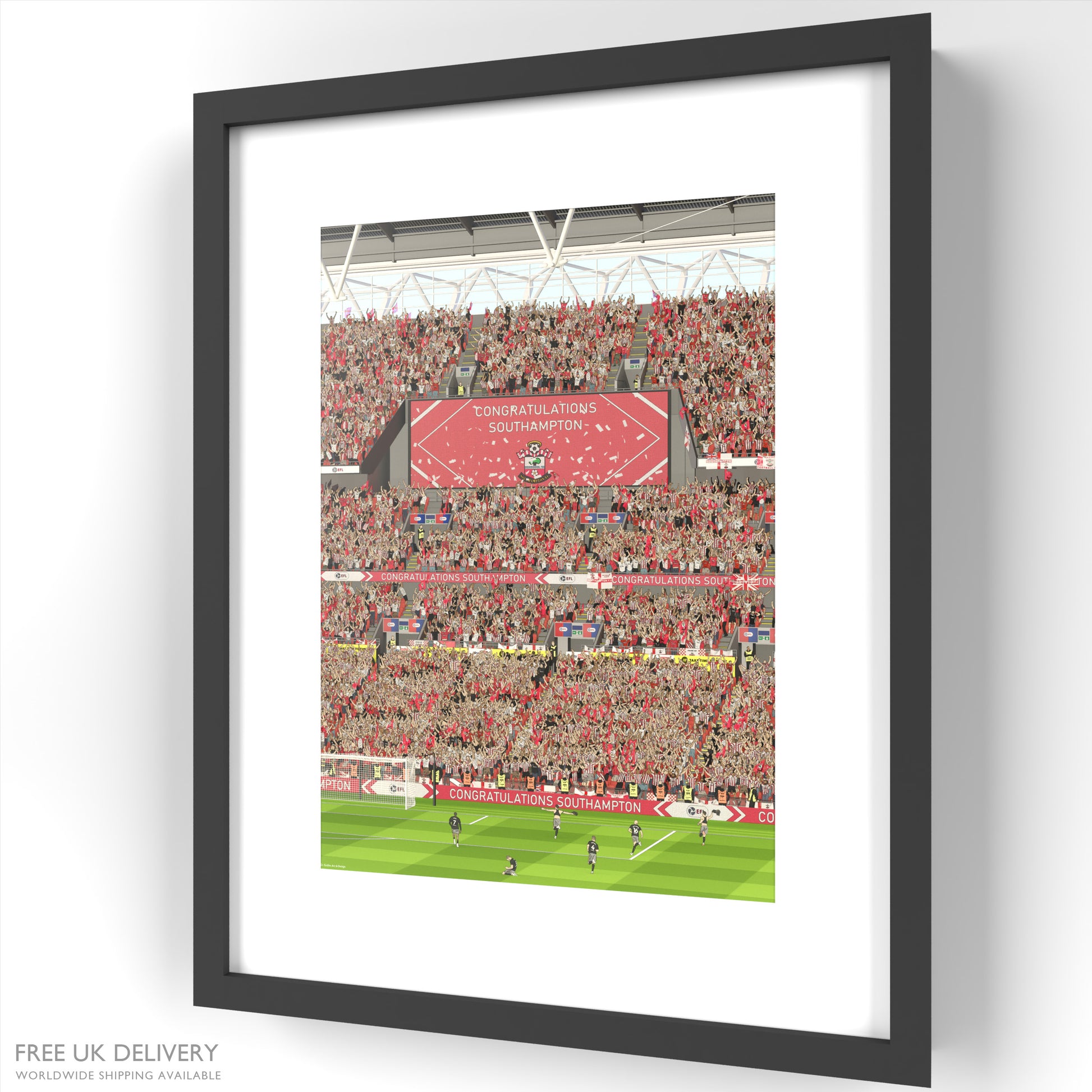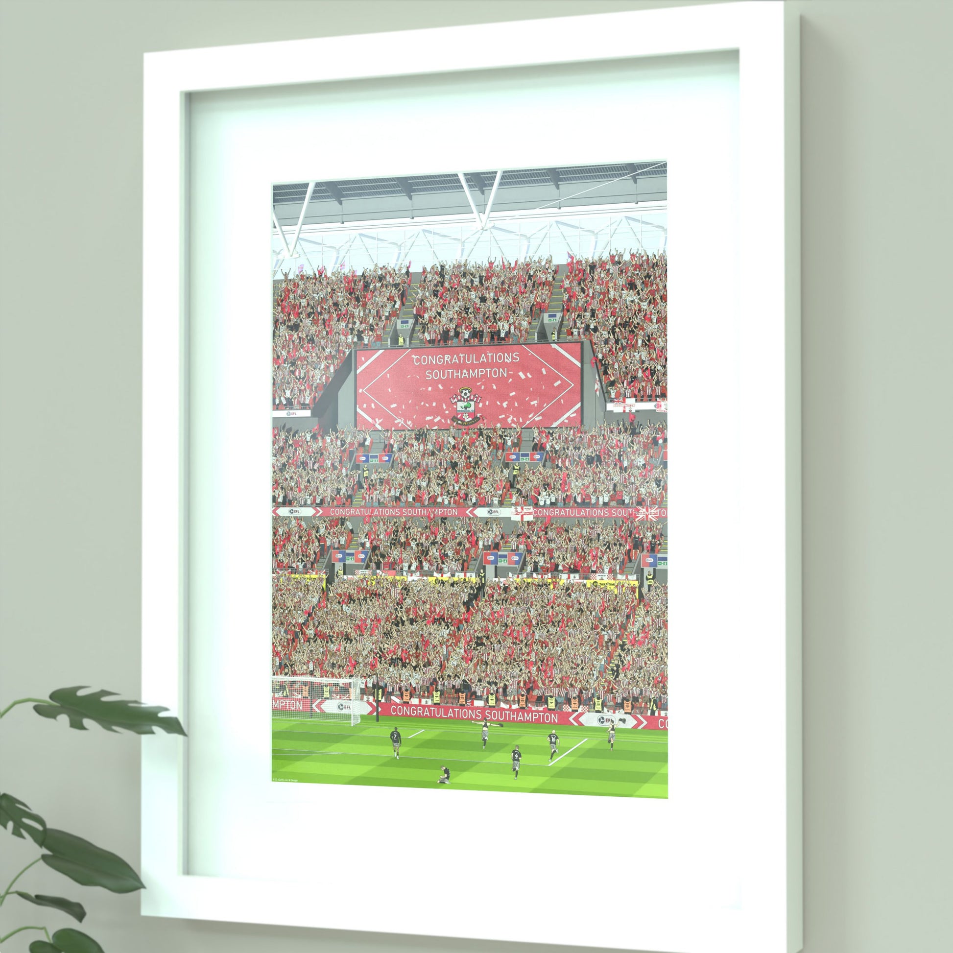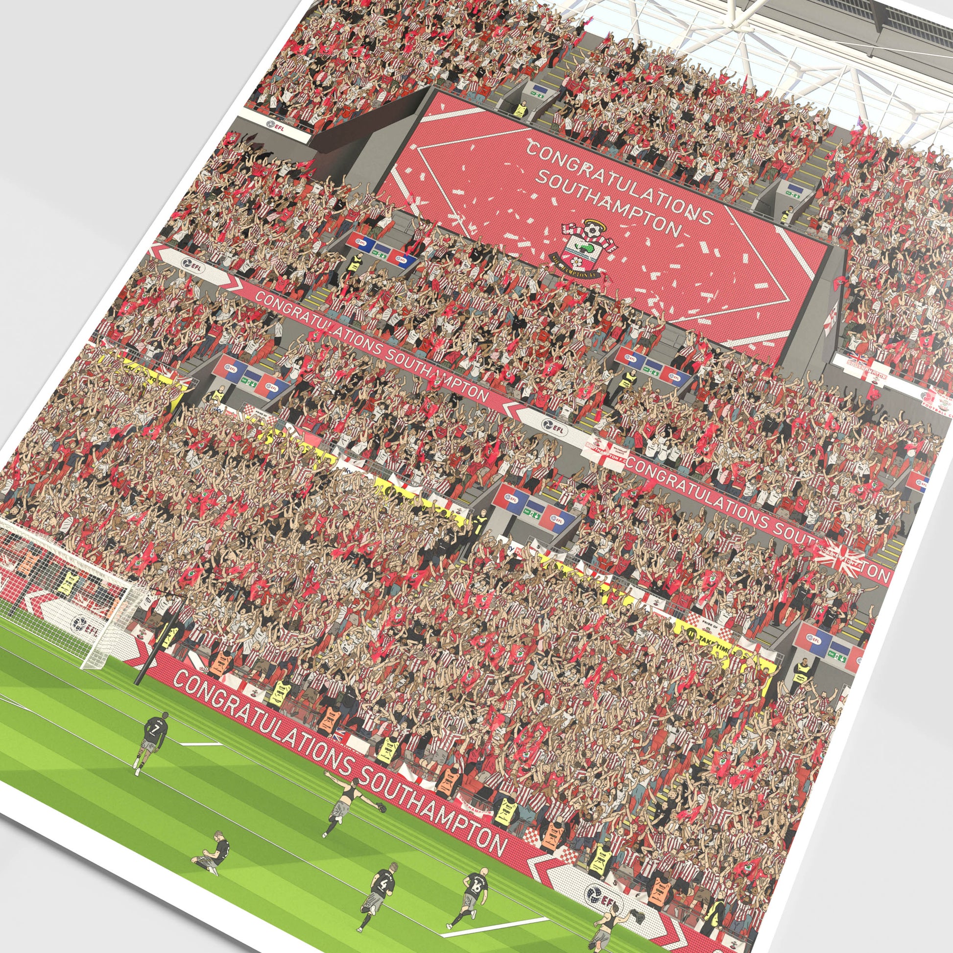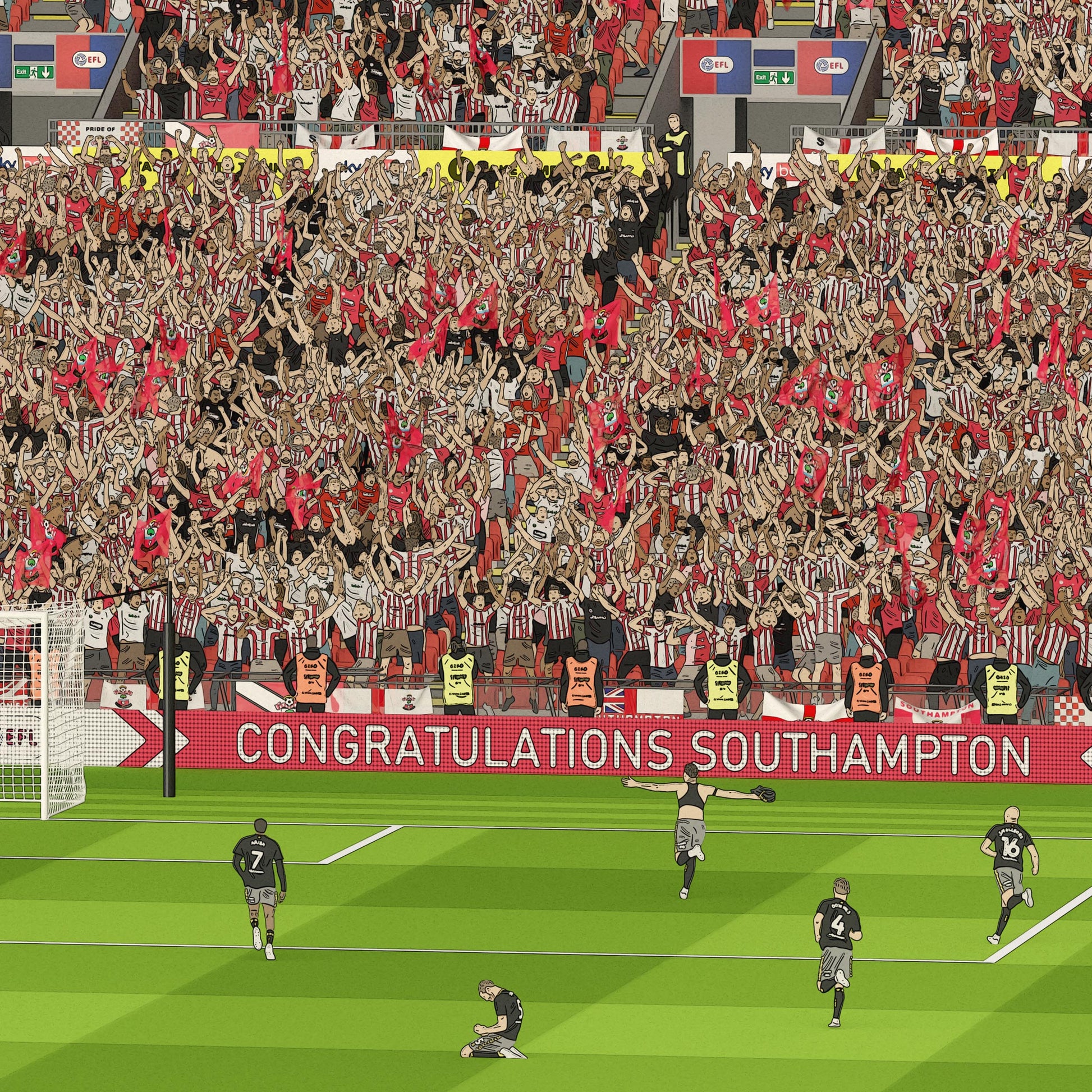 An illustration of the jubilant scenes that followed Southampton’s 2024 Championship Play-Off Final victory against Leeds at Wembley.